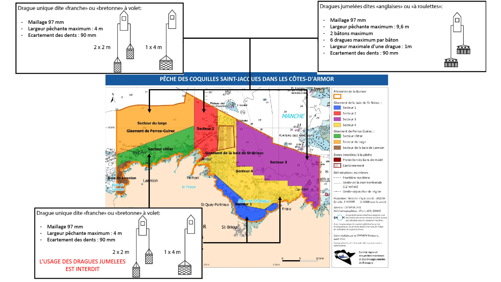 Conditionnement : 10 coquilles de taille marchande (10,5 cm) dans un sac fermé et étiqueté. À l’issue du temps de pêche réglementaire, les dragues doivent être visibles dans leur intégralité le long des pavois.